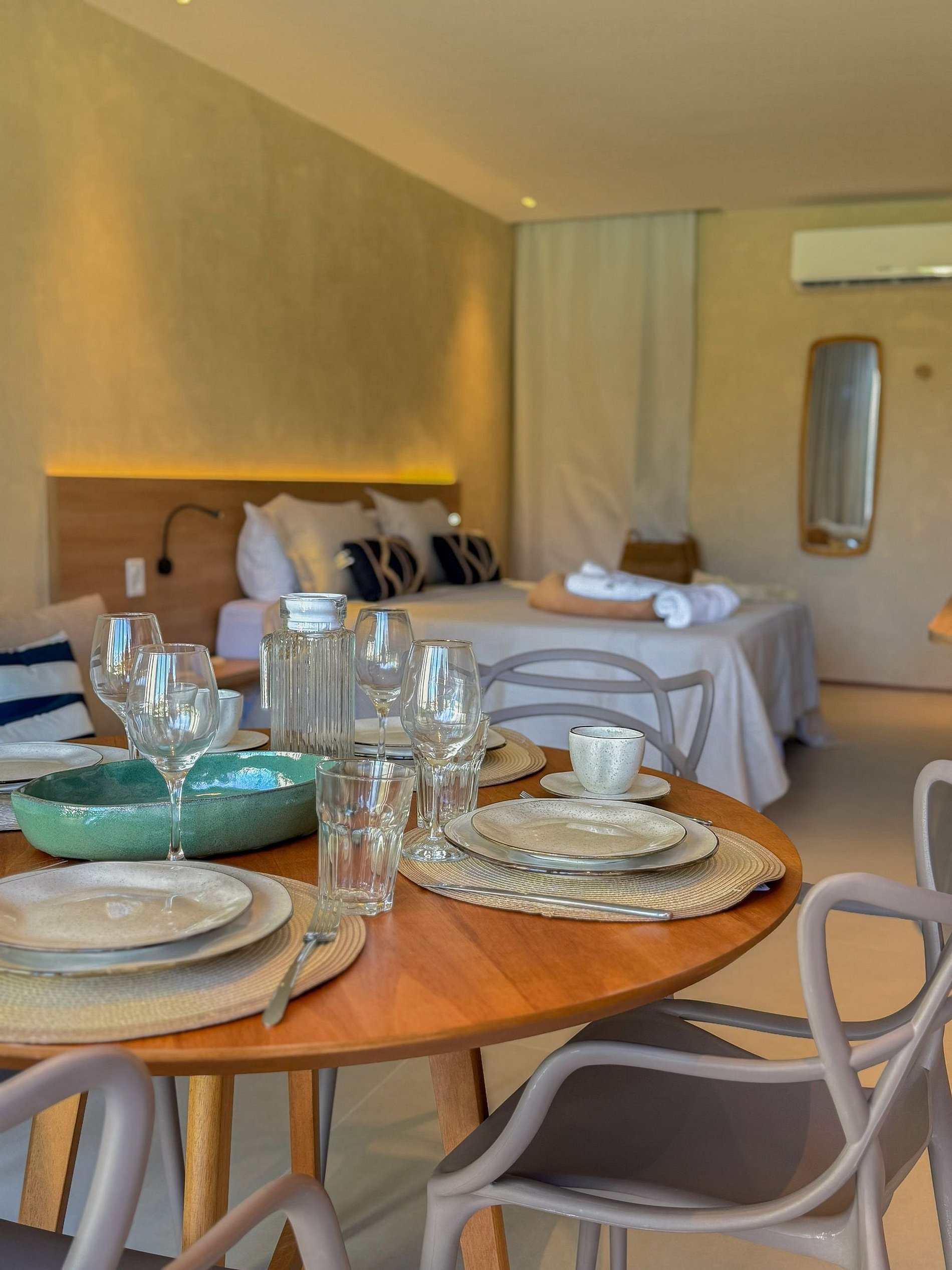 Nosso apartamento se destaca pelo design exclusivo, que combina elementos naturais e contemporâneos para uma vivência luxuosa e tranquila, harmonizada com a paisagem local. A localização beira-mar, em meio a uma área de preservação ambiental, garante privacidade e um contato direto com a natureza. A infraestrutura de lazer completa, com piscina , beach bar e academia, e o compromisso com a sustentabilidade (energia solar) garantem uma estadia confortável, relaxante e consciente.