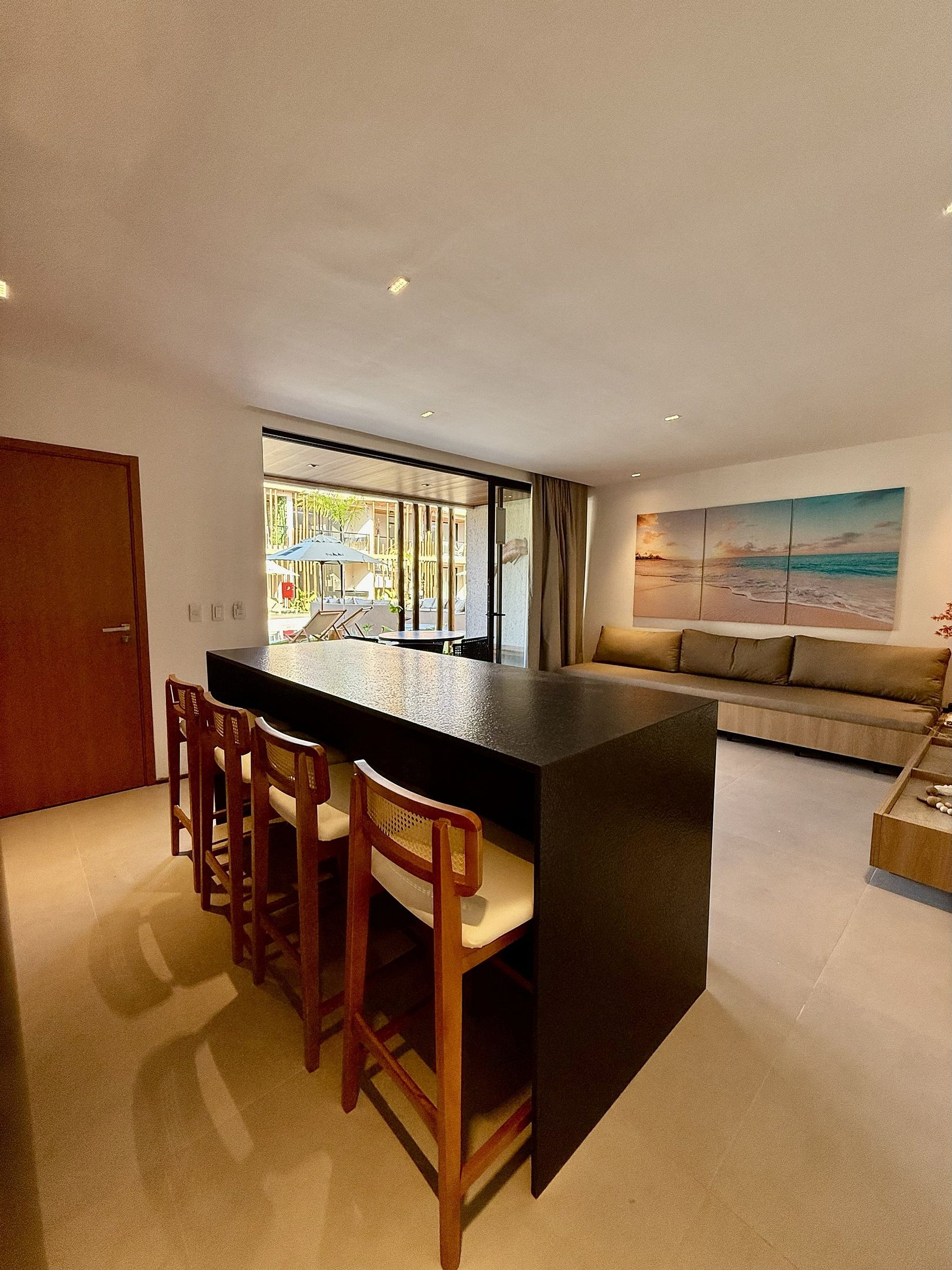 Nosso apartamento se destaca pelo design exclusivo, que combina elementos naturais e contemporâneos para uma vivência luxuosa e tranquila, harmonizada com a paisagem local. A localização beira-mar, em meio a uma área de preservação ambiental, garante privacidade e um contato direto com a natureza. A infraestrutura de lazer completa, com piscina , beach bar e academia, e o compromisso com a sustentabilidade (energia solar) garantem uma estadia confortável, relaxante e consciente.